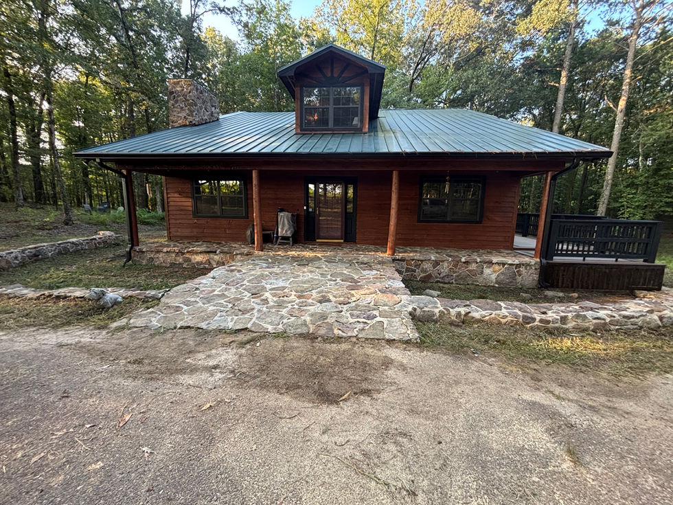 A stunning cabin retreat nestled in the woods, designed with inspiration from the Mississippi State Bulldogs. Featuring a brand-new sunroom with screened porch, custom deck and railing, a modernized kitchen, a cozy new fireplace, and much more.